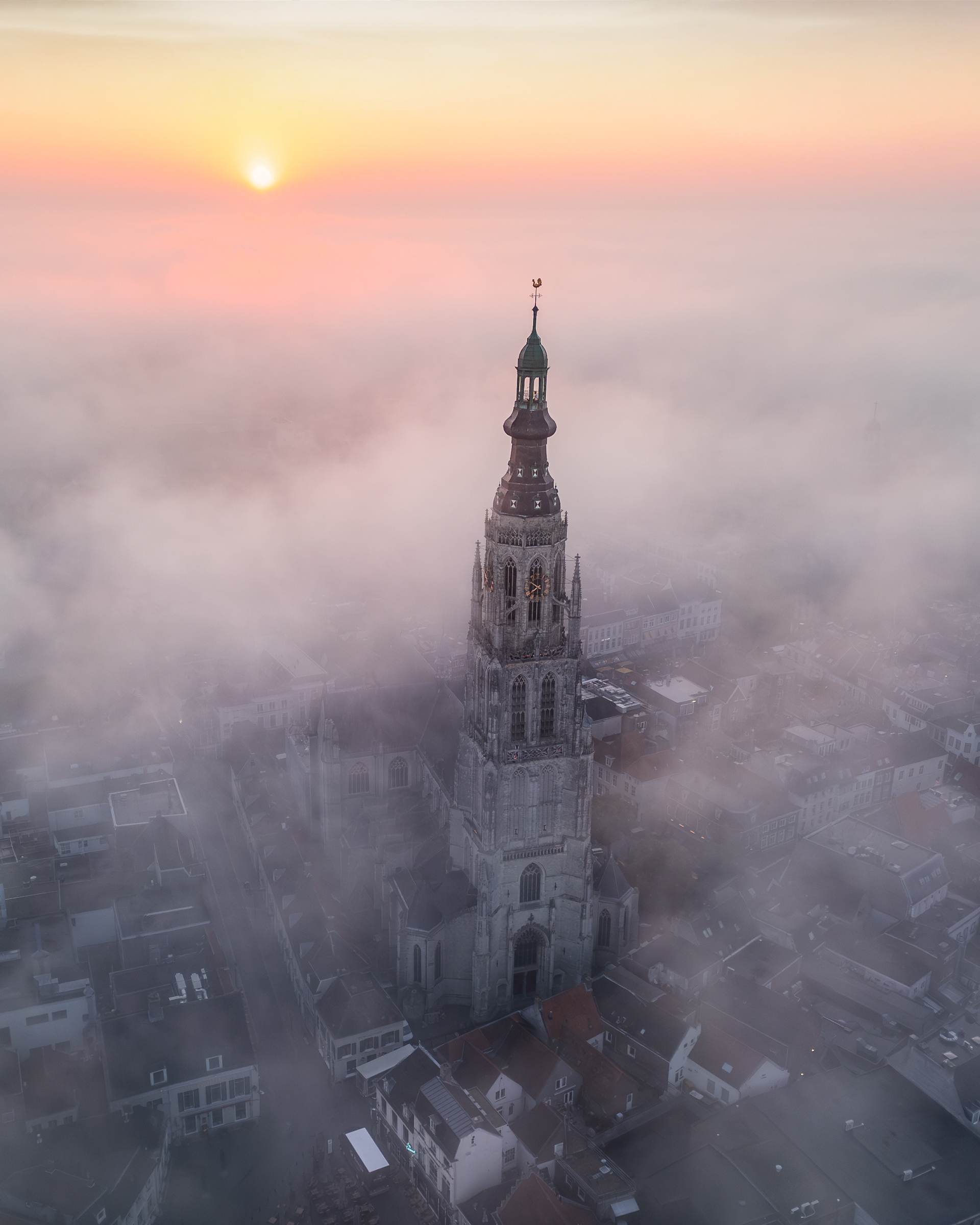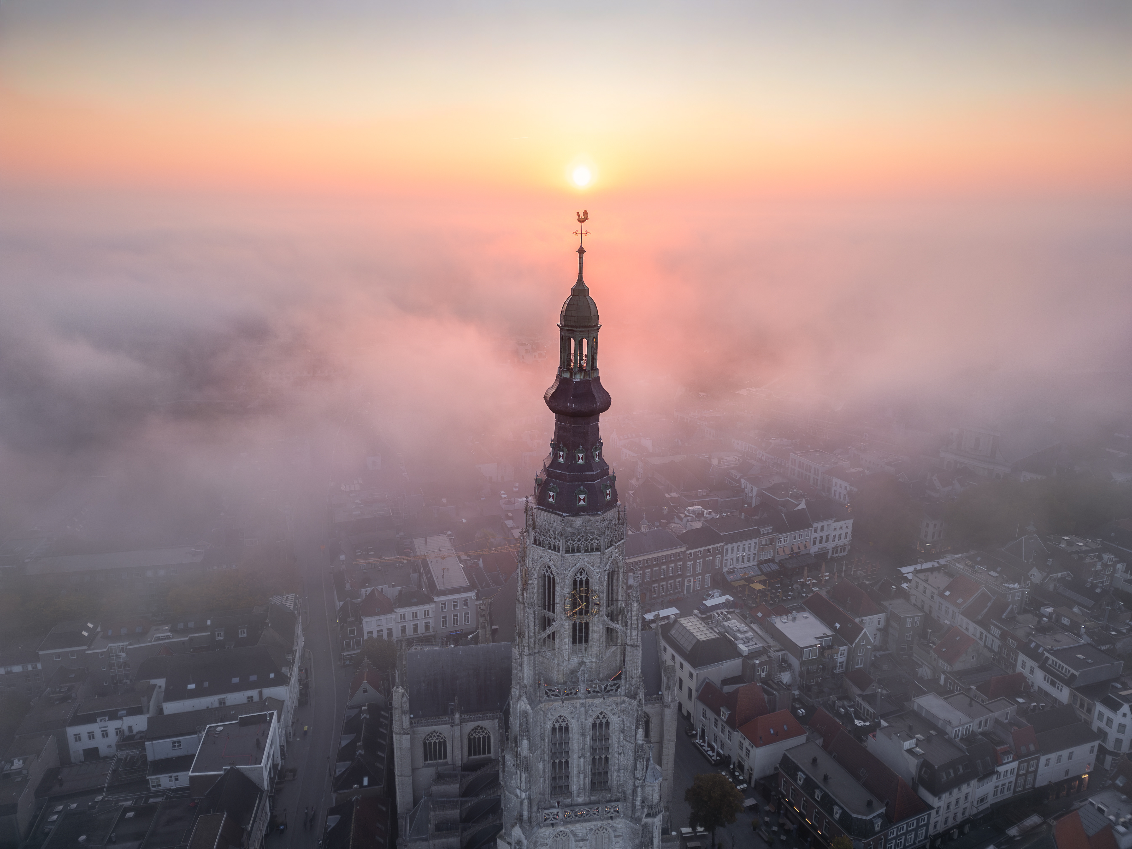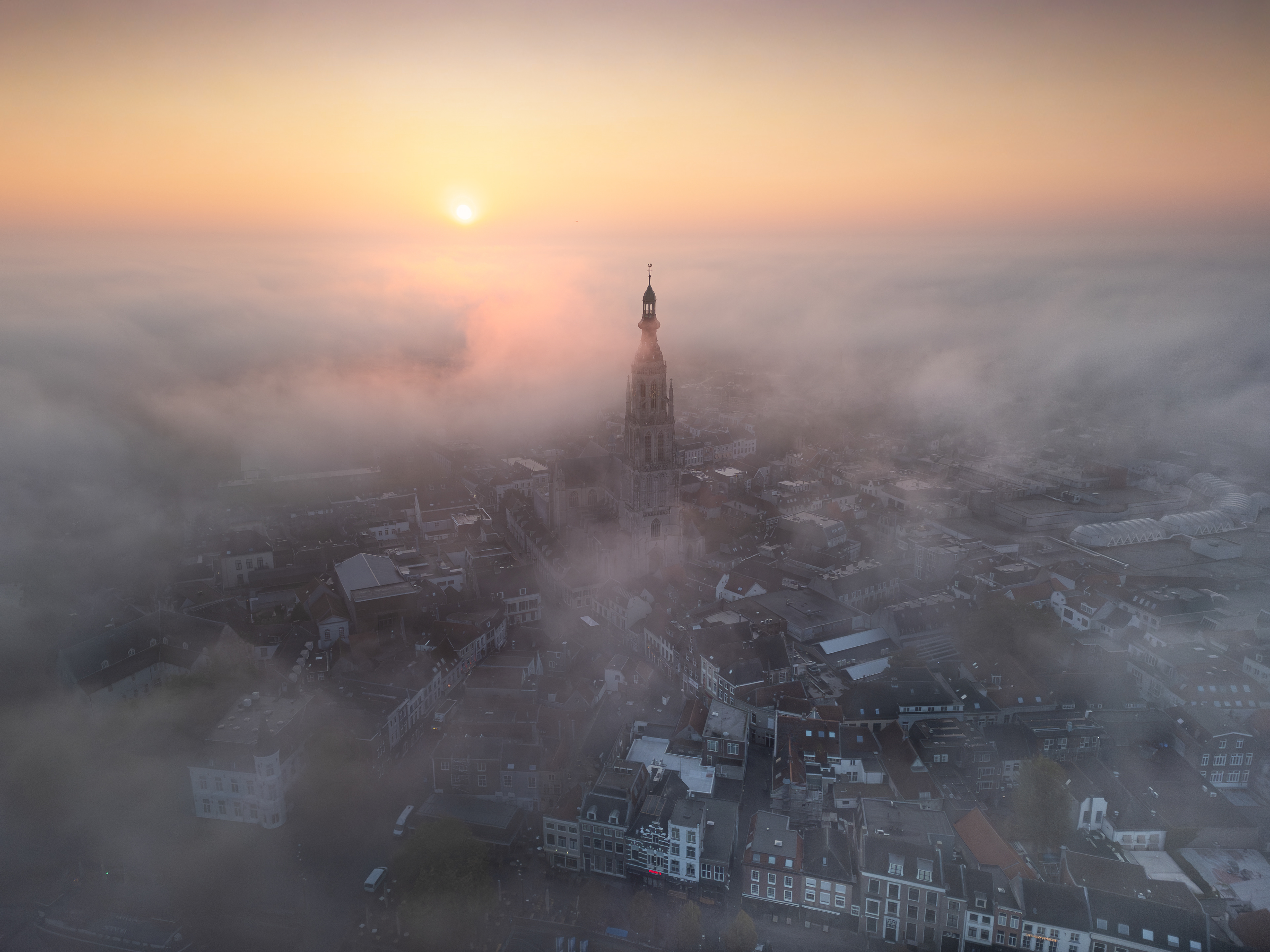 01 oktober 2025 - Tijdens één van de mooie ochtenden deze week heb ik de indrukwekkende kerktoren van de grote Kerk te Breda in de mist vastgelegd. Wat een schitterend historisch gebouw! Flarden van mist die is als een deken over de stad heen ligt... Het zorgde voor een geweldig decor. Onbeschrijfelijk hoe mooi de zon het wolkendek in kleur zette! De ochtendjes waar je het voor doet. Deze beelden zijn vastgelegd met mijn DJI Mini 3 Pro.