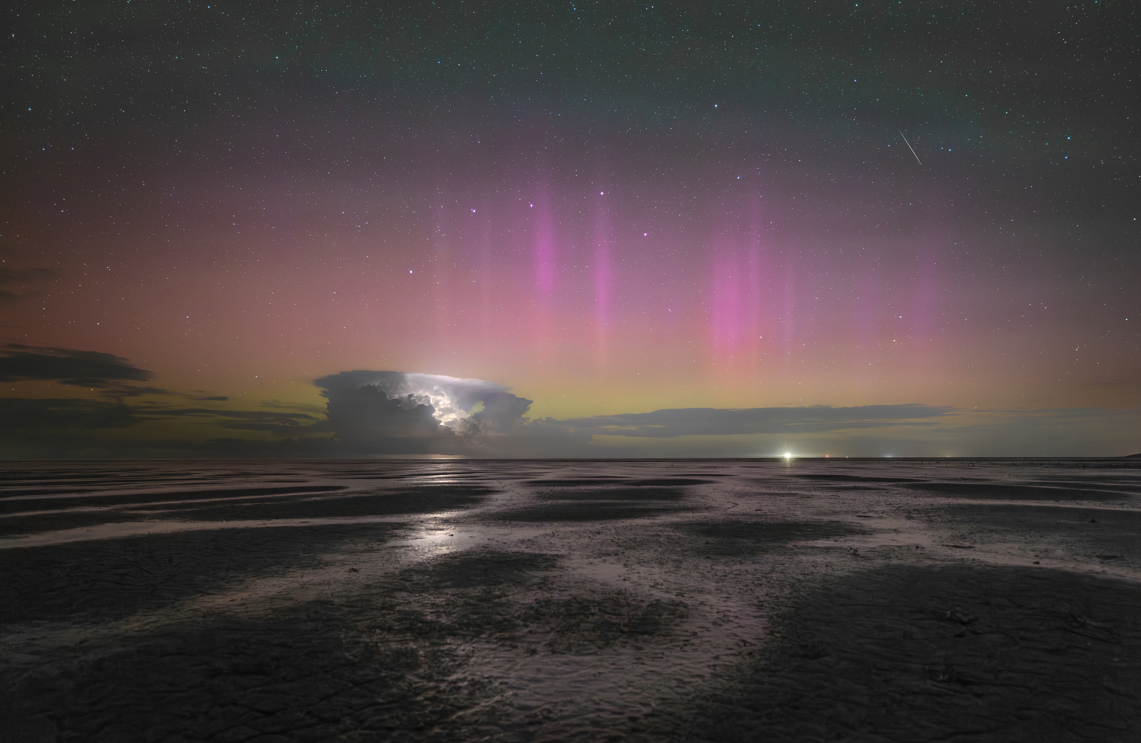 Het mooiste shot van de avond viel voor mij precies 03:15, 02 sep. 2025. Dansende pilaren van Aurora Borealis, weerkaatsend in de poeltjes van het wad, een oplichtende onweersbui, het sterrenbeeld ‘Grote beer’ perfect in de compositie en om het compleet te maken een mooie vallende ster en ja, allemaal in één singleshot. Wat een onvergetelijk moment! Dit was “once in a lifetime!” En dat alles in het gezelschap van Gijs de Reijke en Ilco Rietveld. Oh, en het felle lampje dat je ziet, is de vuurtoren van Ameland.